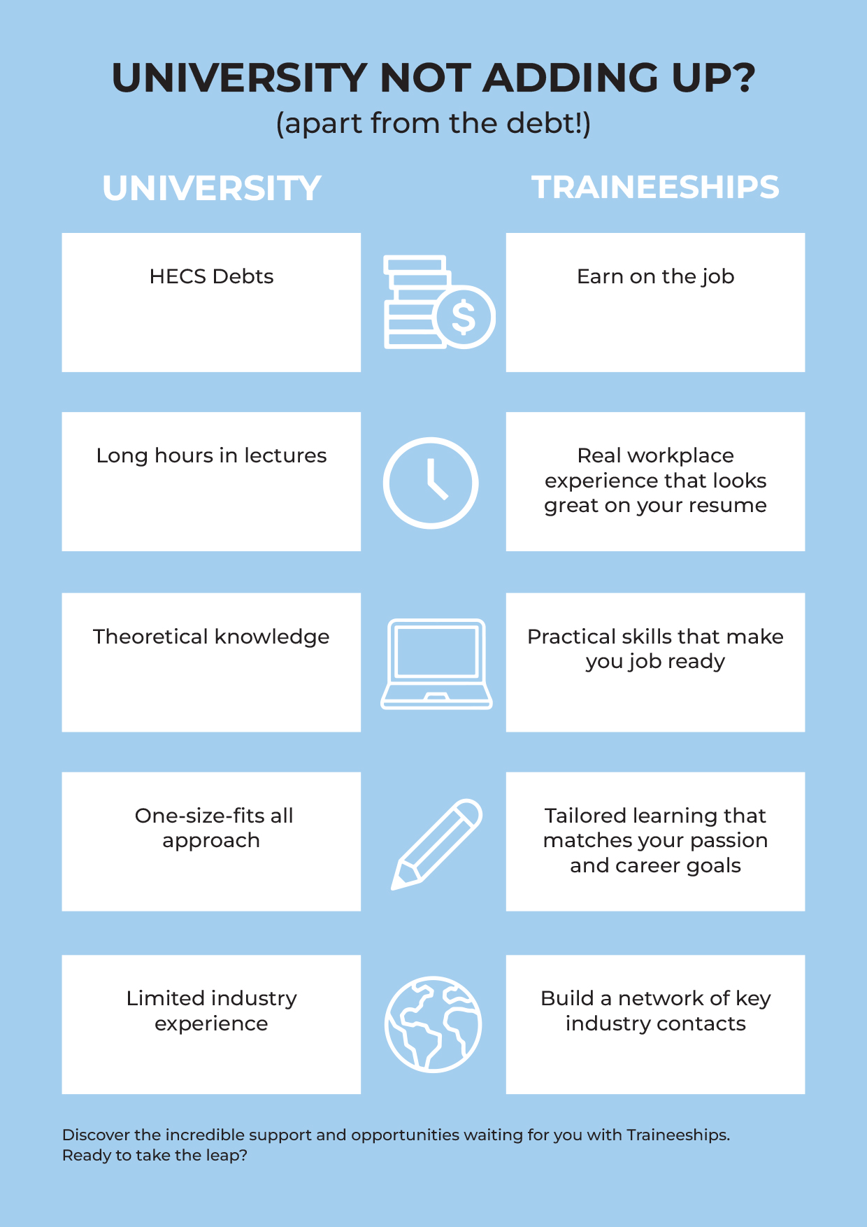 So why put yourself in debt when you can choose Traineeships and secure a successful future? Say goodbye to student debt and embrace the opportunity to achieve your dreams!